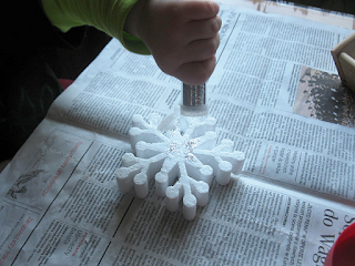 A teraz czas wziąć się do pracy. Przede wszystkim przygotujmy sobie nasz warsztat, żeby nieco ograniczyć ogrom chaosu i bałaganu. Przyda się jakaś gazeta albo inny papier czy folia, który łatwo będzie zgarnąć i wyrzucić razem z bałaganem. Na pierwszy ogień u nas poszły śnieżynki, które pomalowałam dokładnie klejem, a Tosia obsypała gęsto brokatem.